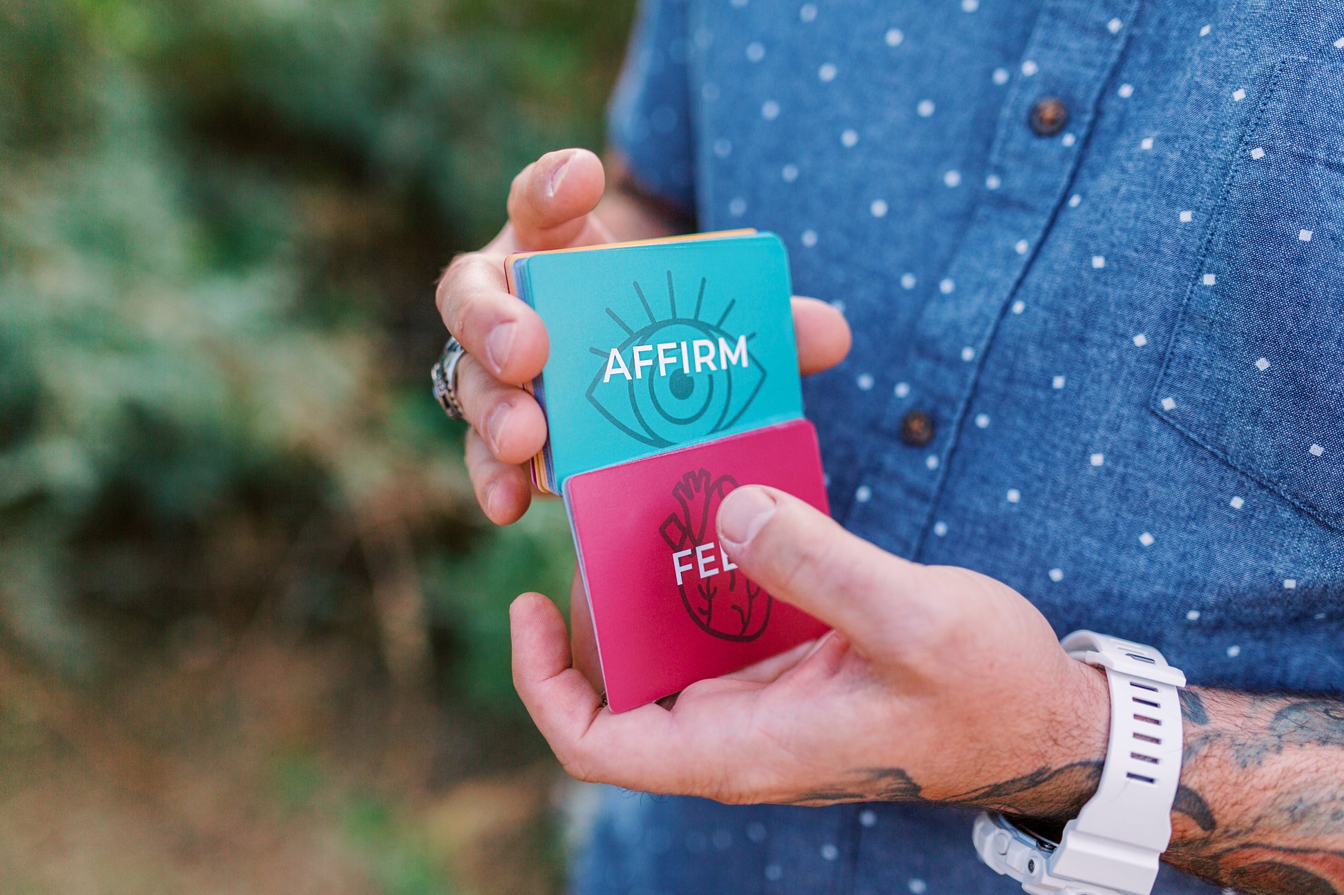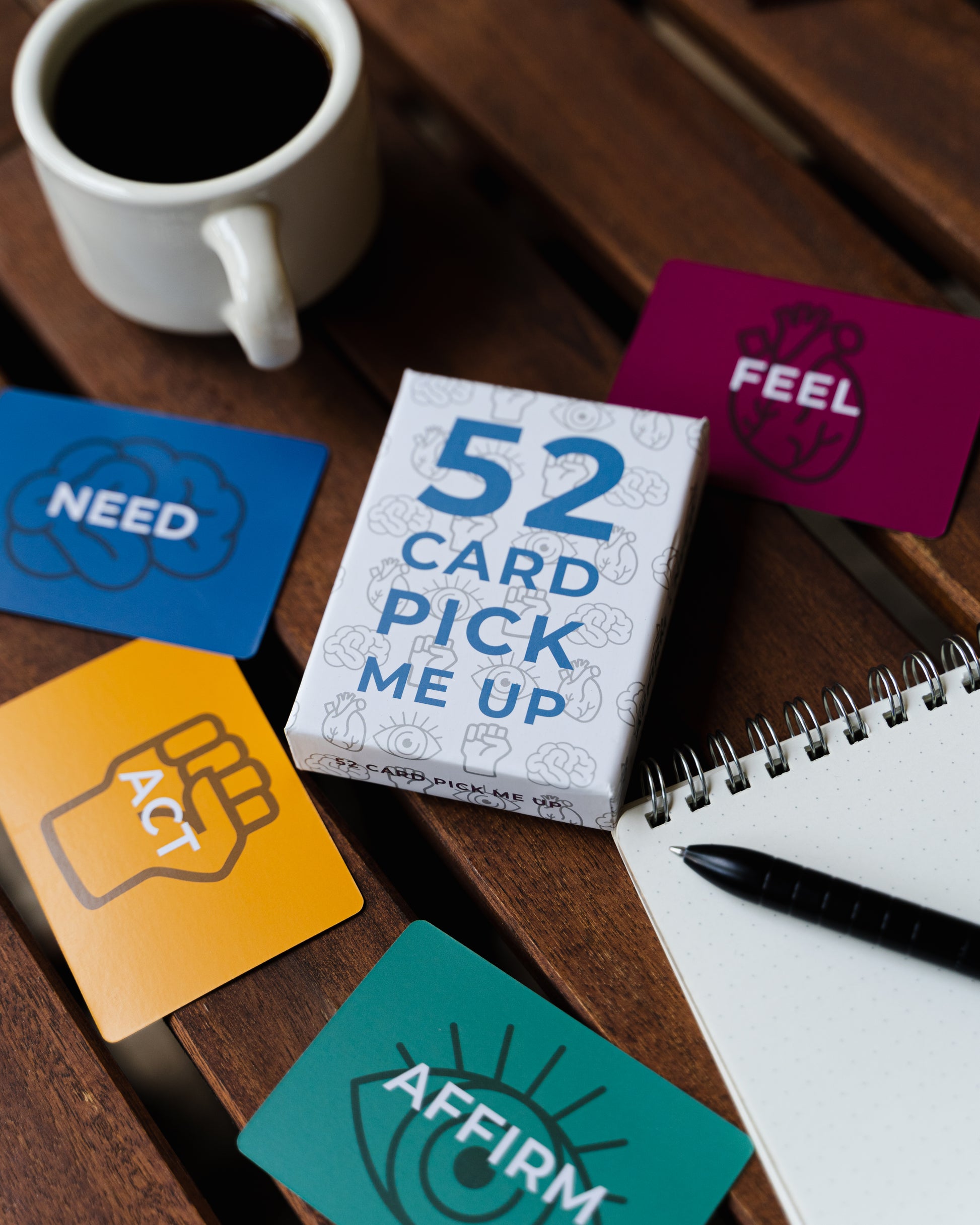 52 Card Pick Me Up is the perfect conversation starter, with yourself, your partner, your team, or with a group of friends. 4 suits identify different points of our life and ways to be vulnerable or introspective. The suits are AFFIRM - NEED - ACT - FEEL and with 13 corresponding words in each suit, you'll find that no matter how far you are down the road, the journey is just beginning.